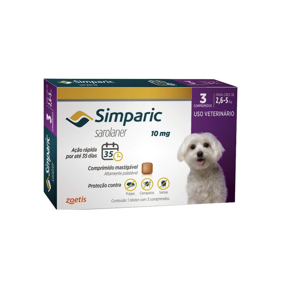 ANTIPULGAS E CARRAPATOS ZOETIS SIMPARIC 10MG C/ 3 COMPRIMIDOS